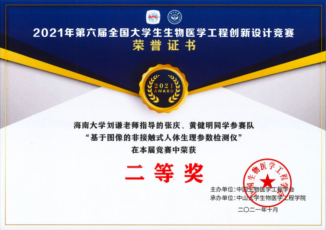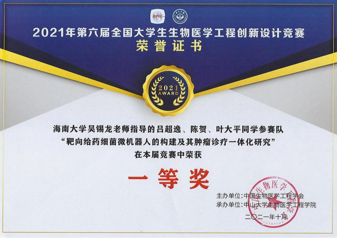 2021年10月31日,第六届全国老员工生物医学工程创新设计竞赛决赛在中山大学以线上方式举行。在此次竞赛中公司参赛作品《靶向给药细菌微机器人的构建及其肿瘤诊疗一体化研究》(指导教师:吴锡龙,参赛员工:吕超逸、陈贺、叶大平)、《基于图像的非接触式人体生理参数检测仪》(指导教师:刘谦,参赛员工:张庆、黄健明)分获全国一等奖和二等奖各1项。此外,作品《基于智能眼镜的健康参数监测系统》获三等奖。