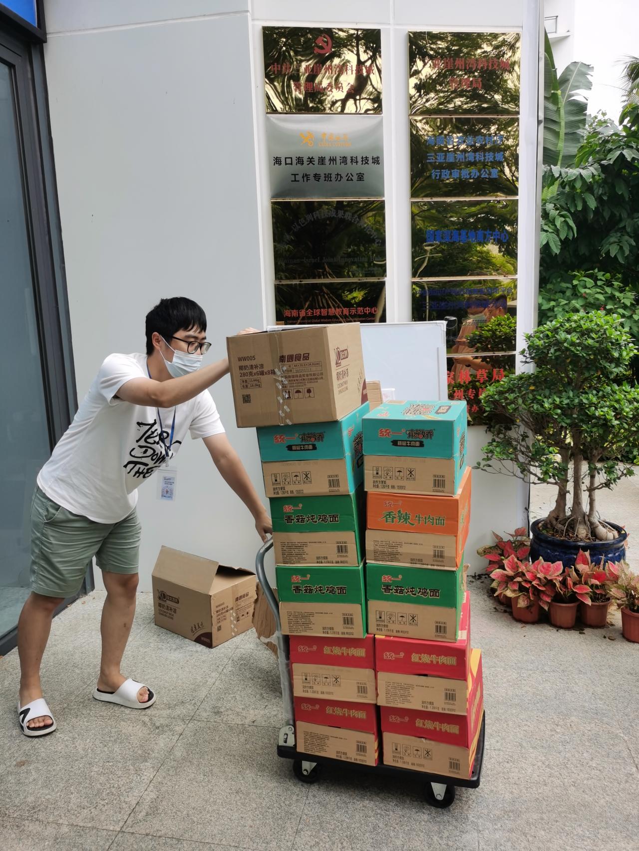 梁丰研老师积极向单位请缨,申请通行证,担任师生物资的保障员和协调员,几乎每天都会统计师生们的盒饭、药品、生活用品等物资的采购需求,并为大家一一配送。由于员工及老师的静态管理地点较为分散,需求也是多种多样,梁老师从无怨言尽量满足员工们的需求,“只要同学们健康、开心,我多跑几趟没关系”。梁老师为了让大家的饮食尽可能丰富,他会在小区物资群里为大家抢购蔬菜包、水果包,并联系了多个线上线下渠道进行采购,确保物资充沛。