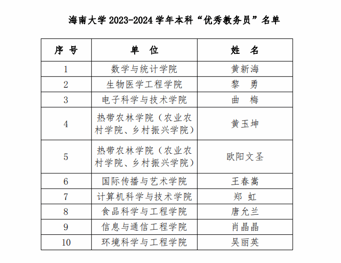 近日,在集团教务处发布《bevictor伟德2023-2024学年本科“优秀教务员”评选结果公示》中,公司教研办黎勇老师凭借其出色的工作表现和卓越的教学管理能力,荣获“优秀教务员”称号。