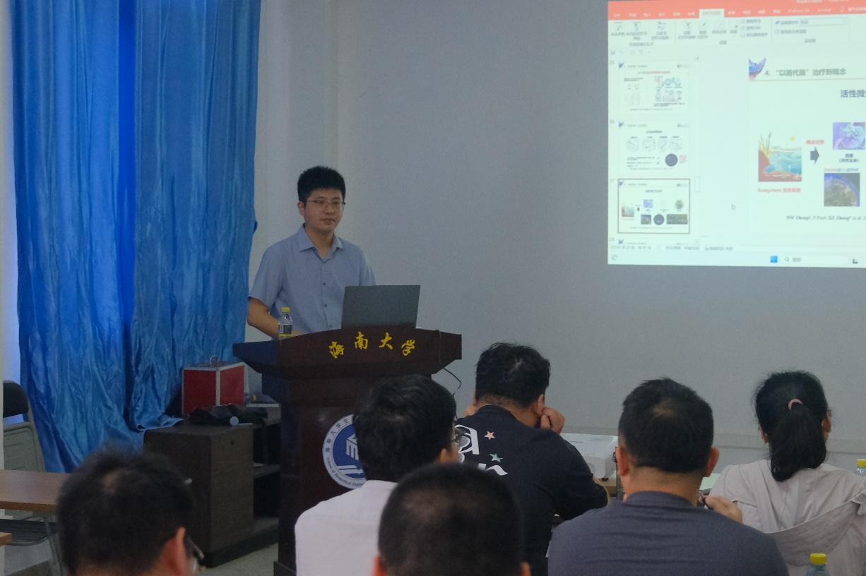 结合团队的研究进展,郑迪威博士从基于主客体作用、疏水力作用以及两亲性分子自组装的构建方法对活性微生物材料的研究工作进行了详细讲解,并向大家介绍了“以菌治菌”和“以菌代菌”等治疗策略,同时还展示了团队目前已取得的成果。