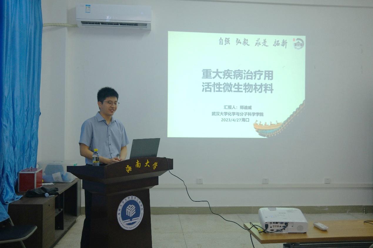 2023年4月27日,伟德体育学者论坛第四期在公司召开。武汉大学化学与分子科学公司特聘副研究员郑迪威为公司师生开展题为《重大疾病治疗用活性微生物材料》的专题讲座。