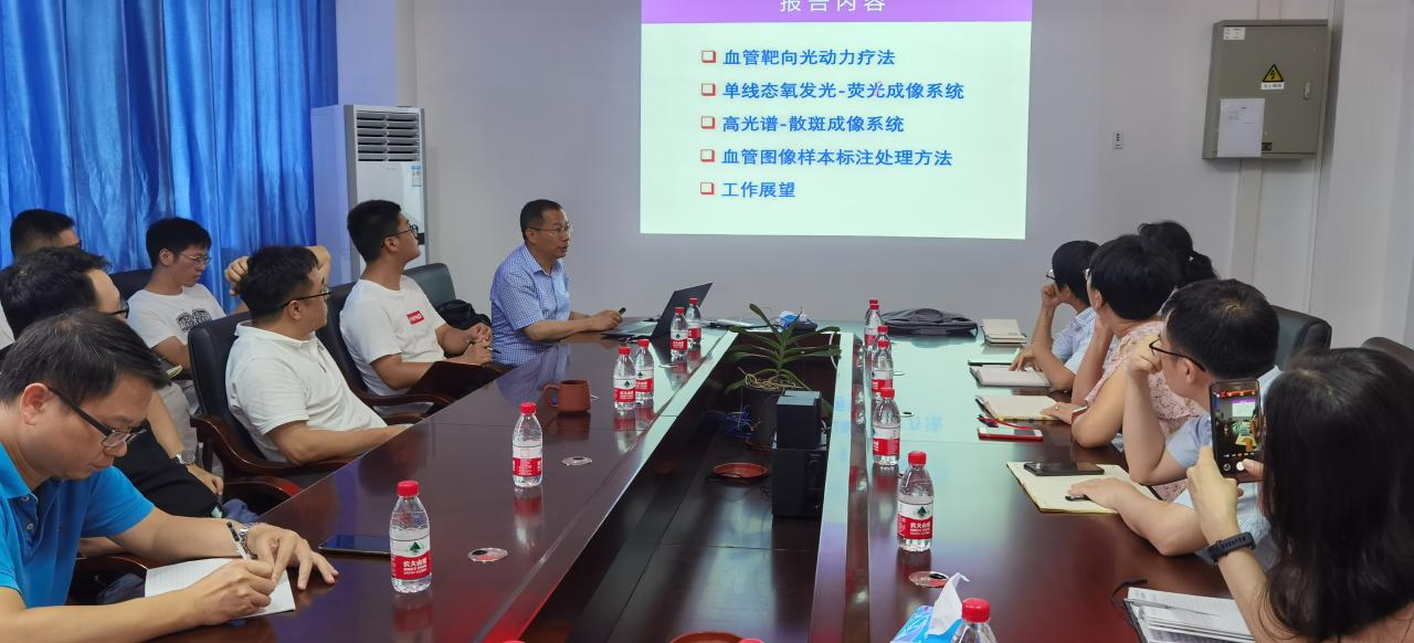 6月7下午,福建师范大学李步洪教授受邀来公司做学术交流,学术报告会由刘谦经理主持。首先李教授做了《多模光学成像技术定量监测光动力血管损伤》的学术报告,报告后公司师生和李教授就报告内容进行充分的交流。