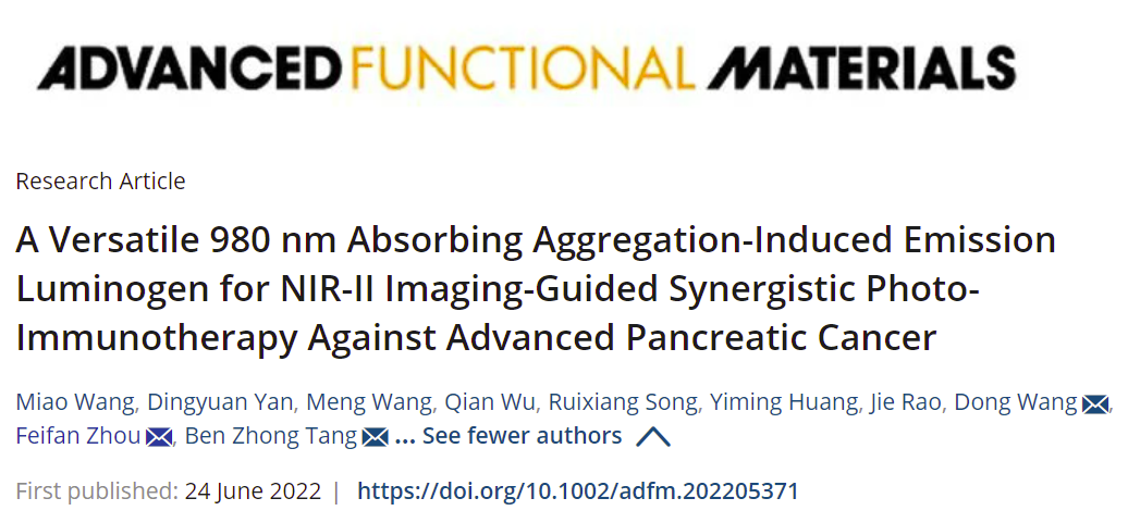 胰腺癌被称为癌中之王,其5年生存率仅为10%左右,如何有效治疗胰腺癌是生物医学和临床领域所面临的最具挑战性的问题。近日,bevictor伟德周非凡教授和深圳大学唐本忠院士、王东教授合作开发了一种新的胰腺癌治疗策略,利用具有聚集诱导发射倾向的980 nm吸收剂,实现了胰腺原位深层成像和光热-免疫联合治疗,有效靶向杀伤原位肿瘤并诱导免疫效应抑制肿瘤转移。相关研究成果以“A Versatile 980 nm Absorbing Aggregation-Induced Emission Luminogen for NIR-II Imaging-Guided Synergistic Photo-Immunotherapy Against Advanced Pancreatic Cancer”为题发表在《Advanced Functional Materials》(IF=19.924)。
