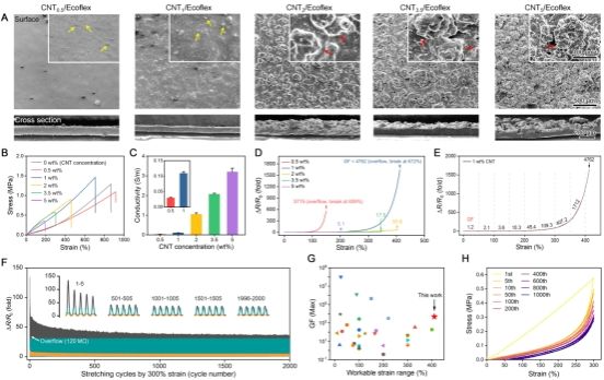 图2.CNT/Ecoflex CEFs的结构、力学、电学和力电响应性能的部分表征结果。